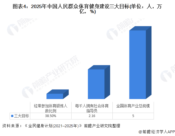 为了深入贯彻全民健身,深化体育产业的建设,国家提出《全民健身计划(2021—2025年)》,到2025年,全民健身公共服务体系更加完善,人民群众体育健身更加便利,健身热情进一步提高,各运动项目参与人数持续提升,经常参加体育锻炼人数比例达到38.5%,县(市、区)、乡镇(街道)、行政村(社区)三级公共健身设施和社区15分钟健身圈实现全覆盖,每千人拥有社会体育指导员2.16名,带动全国体育产业总规模达到5万亿元。