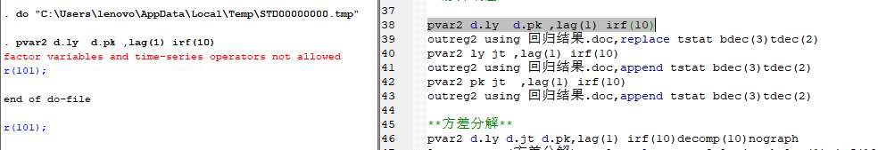 在用面包数据做pvar模型时候,一阶差分平稳,做到脉冲响应时候出现了factor variables and time-series operators not allowed提示,请问这个该怎么解决呢