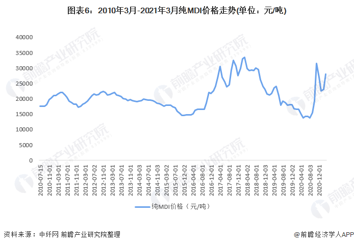 从2013年1月-2021年3月中国聚合MDI价格走势来看,2017年聚合MDI市场价格走强,国内出口大量增加,多重因素叠加推高了聚合MDI的价格,2017年9月达到历史高位43000元/吨。综合来看,价格上涨主要有两个方面因素:一是海外市场需求稳定,支撑价格出现缓慢上行;二是前期市场一致预期聚合MDI价格出现下跌,导致下游和分销市场库存较低,现货货源紧张。到了2018年整体上来看+国内聚合MDI供应面较为宽松,但开始出现下游需求增速跟不上供应扩张的脚步的现象,近期MDI市场萎靡,2018年9月4日我国聚合MDI市场价格下跌至16500元/吨。2020年,价格保持平稳,波动不大,2021年,价格有明显的上涨趋势,长期来看未来几年国内产能将有大幅扩张,而来自下游及终端行业的需求增长却十分缓慢,前几年的各种政策已经透支了家电行业的需求,对房地产市场持续加压,建筑方面的需求也并不看好,预计国内聚合MDI市场整体压力较大,价格将会持续平稳的趋势。