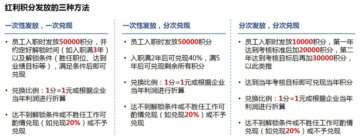 (1)员工入职时发放10000积分,第一年达到考核标准后发放20000积分,第二年达到考核目标后再发放30000积分,以此类推;