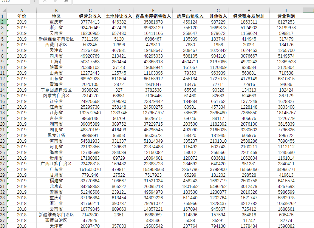 数据指标:经营总收入、土地转让收入、商品房屋销售收入、房屋出租收入、其他收入、经营税金及附加、营业利润