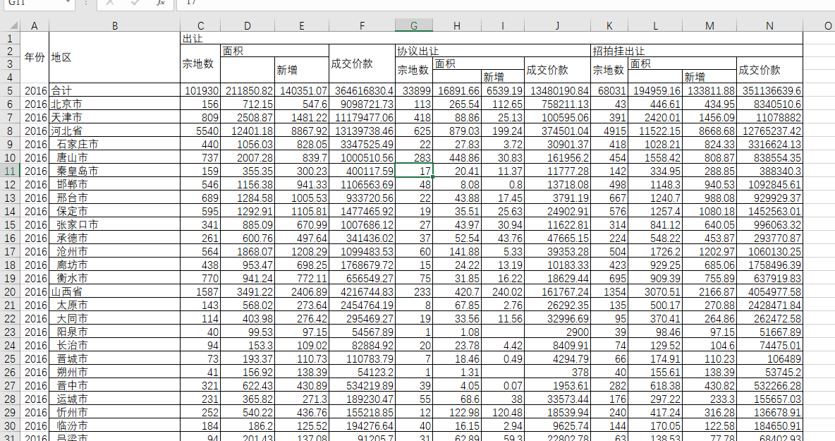 该份数据包含全国31个省所有地级市出让的土地宗数、成交价格以及相较于上一年土地面积的增长量。