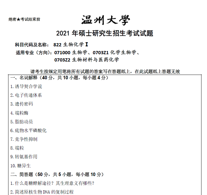 822 生物化学Ⅰ(温州大学2021年硕士研究生招生考试试题).pdf
