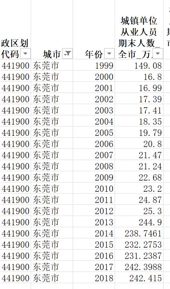 我最近有需要用到地级市从业人数,把单位从业人数和私营个体从业人数加总,数据来源是《中国城市年鉴》,随便看了几个城市,数据都有错误,比如东莞市单位从业人数,1999年是149.8万人,2000年就变成了16.8万人,2012年是25.3万人,2013年是24.9万人,很明显这个数据有问题。不知道小伙伴们都是如何处理这个从业人数问题的,求指教~