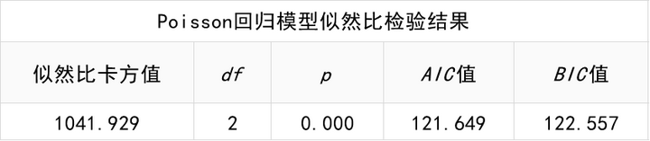 针对Poisson回归分析,SPSSAU共输出2个表格,分别是:似然比检验结果表以及Poisson回归分析结果汇总表。