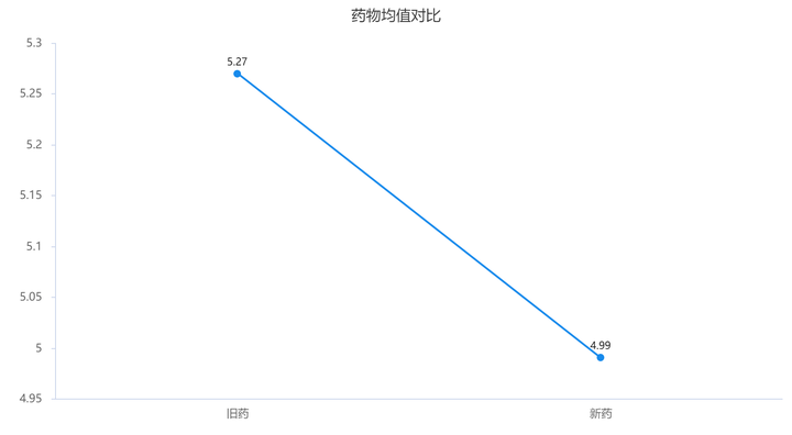 通过上表可知,新药使用B组群体整体胆固醇水平均值为4.991,小于普通药物组别的5.267,即说明新药对于胆固醇水平的帮助性明显更好。