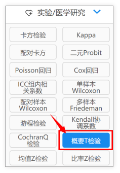 第1步:选择【实验/医学研究】→【概要T检验】