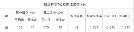 本次收集A地区和B地区20岁男子身高数据,A地区为168cm,B地区为170cm,A地区与B地区的身高差值为-2cm,而且差值95%CI为:-5.215cm~1.215cm。即有95%的把握两个地区身高差值,应该介于-5.215cm到1.215cm之间。