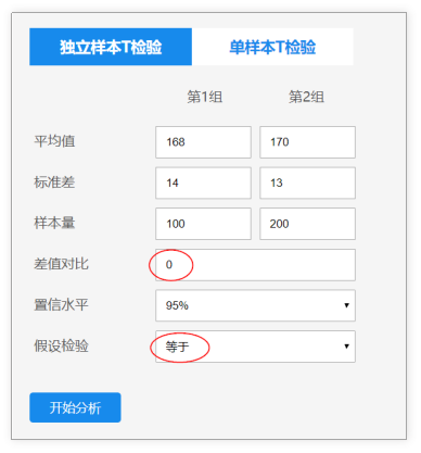 本次研究原假设是两组身高平均值相等(即差值与数字0进行对比),因此差值对比处输入数字0;【如果是研究A地区身高,明显低出B地区身高2cm,那么差值对比值则输入2】。