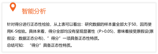 如果样本量大于50,则应该使用Kolmogorov-Smirnov检验结果,反之则使用Shapro-Wilk检验的结果。