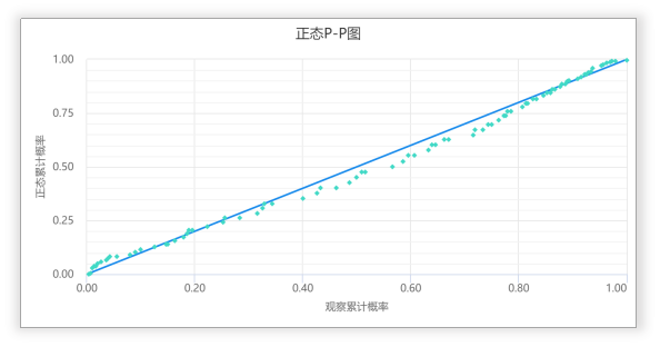 P-P图是将实际数据累积比例作为X轴,将对应正态分布累积比例作为Y轴,作散点图,反映实际累积概率与理论累积概率的符合程度。