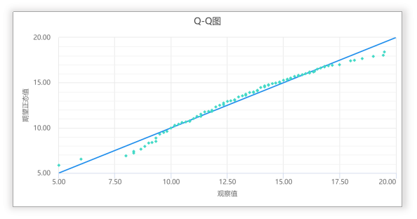 Q-Q图将实际数据作为X轴,将对应正态分布分位数作为Y轴,作散点图,反映变量的实际分布与理论分布的符合程度。