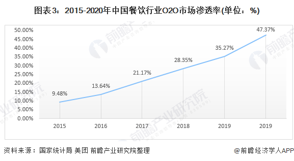 渗透率方面我国餐饮行业O2O渗透率一路高歌。2020年受益于新冠疫情的影响,餐饮O2O在整个餐饮行业市场规模的渗透率加速上涨至47.37%。