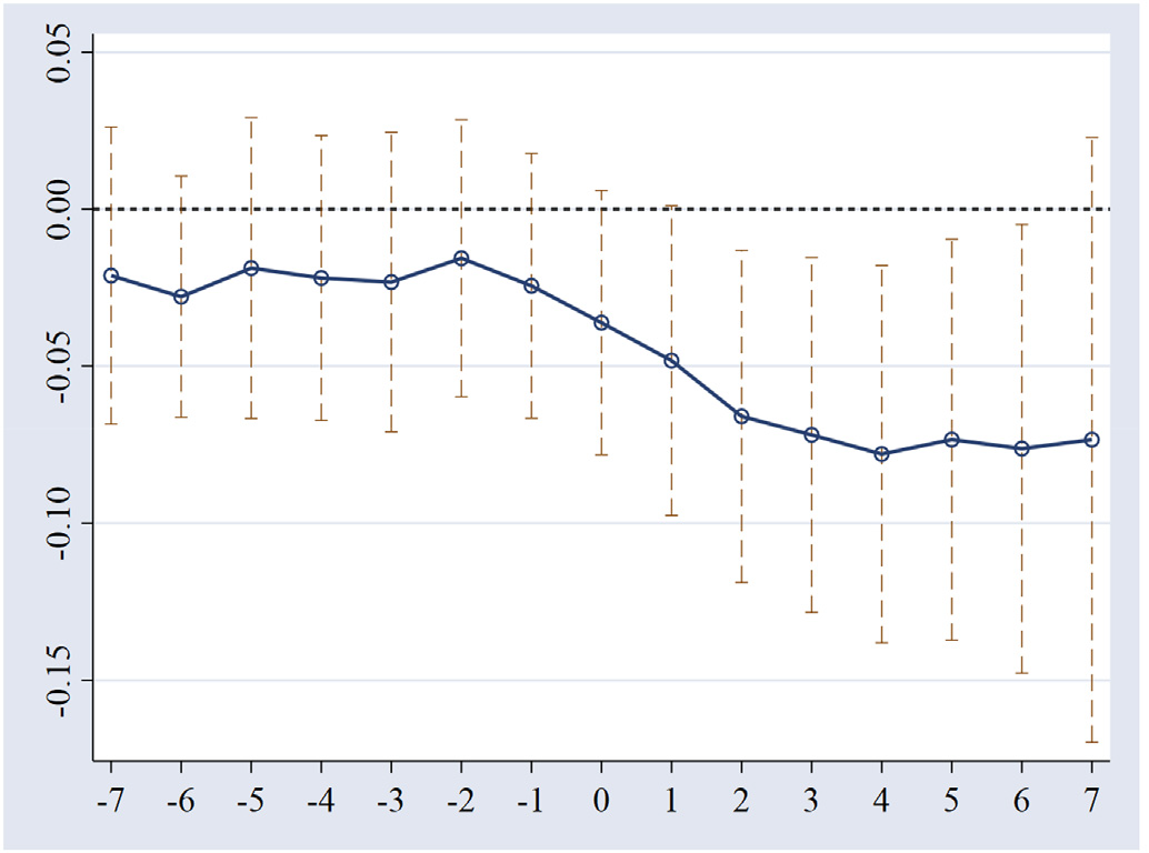 附件文章在使用空间双重差分时进行了平行趋势检验,比较了直接效应系数的差异。请教各位,如何在stata上实现这种检验及作图?原文“Fig. 3 plots the direct effect and the 95% confidence interval of Dk it with the spatial weight matrix ofW1. The horizontal axis is the number of years before and after the initiation of HSR operations. ”