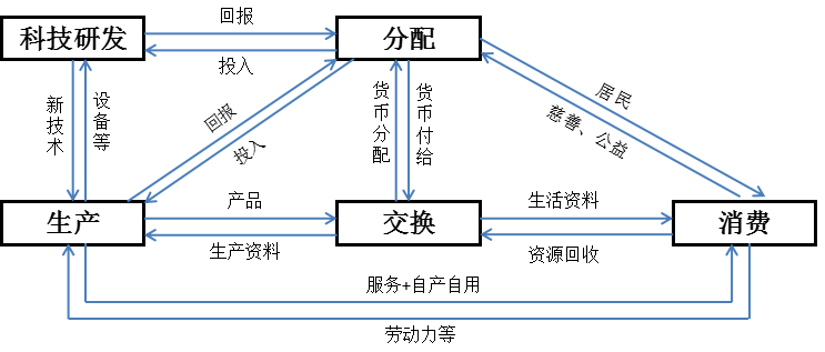 说明:(1)从物质产品的角度看,科研部门不生产技术设备x之外的任何产品,即一般不能为自身生产技术设施Kj、实验耗损物资Ky、生活资料Kr,不直接创造剩余价值或利润(其研发的技术装备如能变现也可能带来更大收益);(2)从实物形态看,第一部类制造的产品中的一部分用于更新并增加本部类用的技术装备和机械设备Ⅰx+Ⅰj+ⅠΔx+ⅠΔj、一部分用于更新并增加第二部类用的技术装备和机械设备Ⅱx+Ⅱj+ⅡΔx+ⅡΔj、一部分用于更新并增加科研部门用的技术设施Kj+KΔj、一部分用于更新并增加本部类用的原材料Ⅰy+ⅠΔy、一部分用于更新并增加第二部类用的原材料Ⅱy+ⅡΔy、一部分用于更新并增加科研部门使用的实验耗损物资Ky+KΔy;从价值形态看,第一部类制造的价值总量中的一部分用于更新并增加本部类用的技术装备和机械设备Ⅰx+Ⅰj+ⅠΔx+ⅠΔj、一部分用于更新并增加本部类用的原材料Ⅰy+ⅠΔy、一部分用于恢复并增加本部类人力资源Ⅰr+ⅠΔr、一部分用于增加本部类人力资源提供者的福利Ⅰf、还有一部分更新和增加科研部门用的生产技术设施Kj+KΔj和实验耗损物资Ky+KΔy;(3)从实物形态的角度看,第二部类制造的产品中的一部分用于恢复并增加本部类人力资源提供者所需生活资料Ⅱr+ⅡΔr、一部分用于恢复并增加第一部类人力资源提供者所需生活资料Ⅰr+ⅠΔr、一部分用于恢复并增加科研部门人力资源提供者所需生活资料Kr+KΔr、一部分用于增加各部类(门)人力资源提供者的福利Kf+Ⅰf+Ⅱf;从价值形态看,第二部类制造的价值总量中的一部分用于更新并增加本部类用的技术装备和机械设备Ⅱx+Ⅱj+ⅡΔx+ⅡΔj、一部分用于更新并增加本部类用的原材料Ⅱy+ⅡΔy、一部分用于恢复并增加本部类用的生活资料Ⅱr+ⅡΔr、一部分用于恢复并增加科研部门用的生活资料Ⅰr+ⅠΔr、一部分用于恢复并增加科研部门用的生活资料Kr+KΔr、一部分用于增加本部类人力资源提供者的福利Ⅱf、一部分用于增加科研部门人力资源提供者的福利Kf。