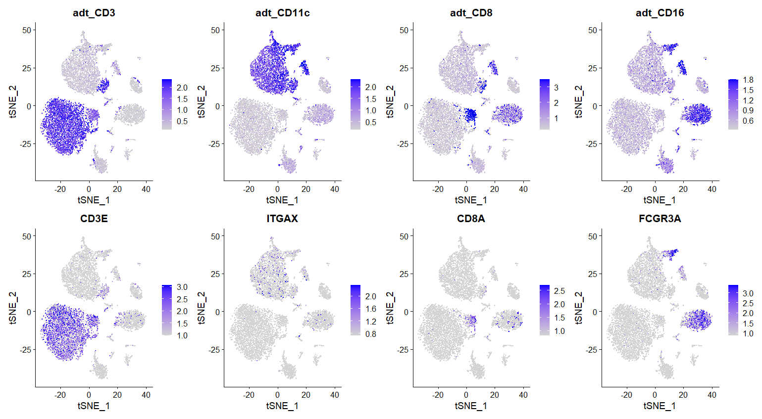 如何对CITE_PBMC数据通过在 Seurat 中实施的 Wilcoxon 测试,通过 CD4 和 CD8 基因的差异表达分析来鉴定簇。我现在有CITE_PBMC_counts_top2000.h5的数据(R加载后,如下图一所示),想呈现可视化CD8和CD4蛋白水平 和 RNA簇上蛋白质水平(具体如下图二和图三所示)。但我刚接触该类型数据和R语言,有以下几个问题,希望大神能指点一下:1. 具有最显着高表达的 CD4 和 CD8 mRNA 的簇分别标记为 CD4 和 CD8 T 细胞,该如何根据h5数据来确定CD4 和CD8的T细胞?