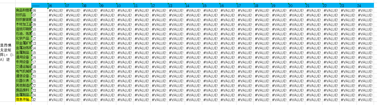 在利用北京市投入产出表时,通过excel计算了单位矩阵I,直接消耗系数矩阵A,在计算里昂惕夫逆矩阵L时,但是结果全是VALUE!,这是怎么回事呢?
