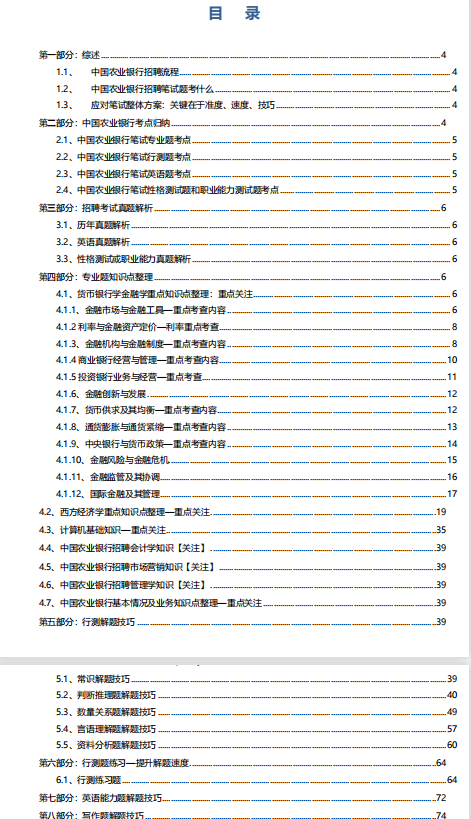 | 中国农业银行精华红宝书讲义 | 1.1中国农业银行招聘流程/考试时间/题型/形式综述 | 1.5中国农业银行综合能力测试练习巩固提高 |