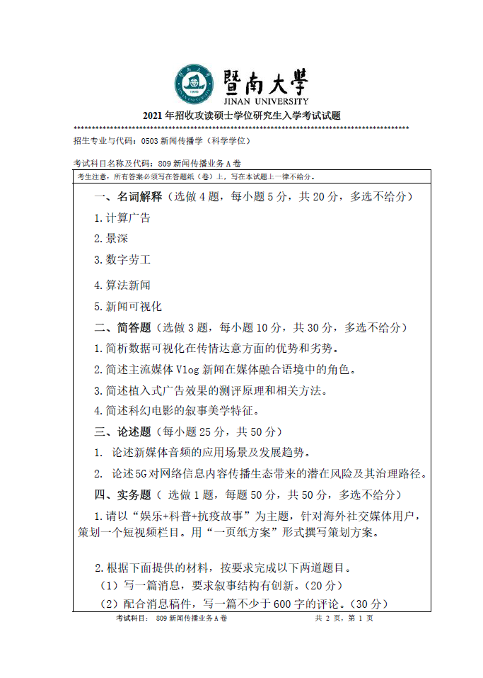 809新闻传播业务(暨南大学2021年招收攻读硕士学位研究生入学考试试题).pdf