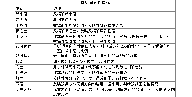 描述性分析用于描述定量数据的整体情况,例如研究消费者对于某商品的购买意愿情况,可用到描述性分析对样本的年龄、收入、消费水平等各指标进行初步分析,以了解掌握消费者总体的特征情况。