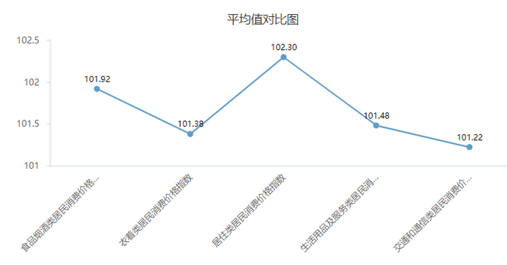 - 集中趋势指标:可见食品类消费指数均值为101.923,中位数为102.000,两者差异不大。