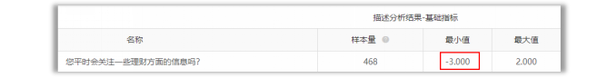 描述性分析还可用于查看数据是否有异常情况(最小值或最大值查看),比如数据中出现-2,-3等异常情况。