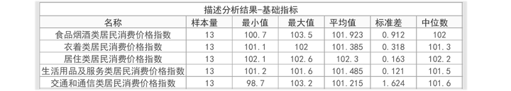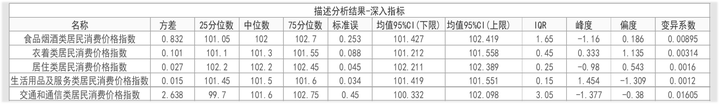 - 离散趋势指标:食品类消费指数方差为0.832,最大值为103.500,最小值为100.700,,两者之差为全距2.8,说明数据较为稳定。