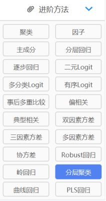 用户可在SPSSAU【进阶方法】-【分层聚类】中可以使用此聚类方法。
