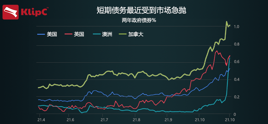 各地的短期债券借贷成本都在飙升。美国两年期公债收益率周五触及 0.55%,为大流行爆发前的最高水平,高于一个月前的 0.21%。英国、澳大利亚和加拿大的走势更为剧烈,整个欧元区的走势也明显走高。