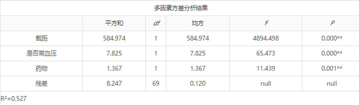 从上表可知,利用多因素方差分析研究是否高血压, 药物共2项对于胆固醇水平的差异关系,模型R平方值为0.527,意味着是否高血压, 药物以解释胆固醇水平的52.71%变化原因。以及分析可知: