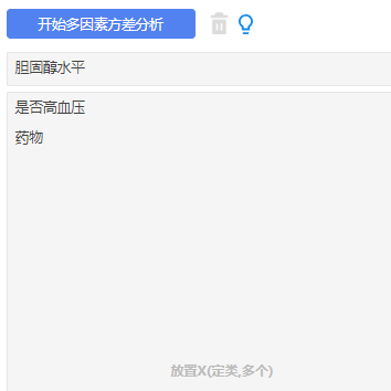 是否高血压, 药物共2项全部均会对胆固醇水平产生显著性差异关系,建议进一步使用单因素方差进一步进行研究。