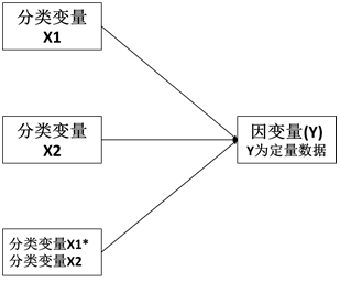 针对交互作用研究,通常情况下自变量X为两个,有时也为多个。自变量X均为分类数据,而因变量Y为定量数据。由于需要研究交互作用,因此模型中会涉及两个分类自变量的交互项(分类变量1*分类变量2)