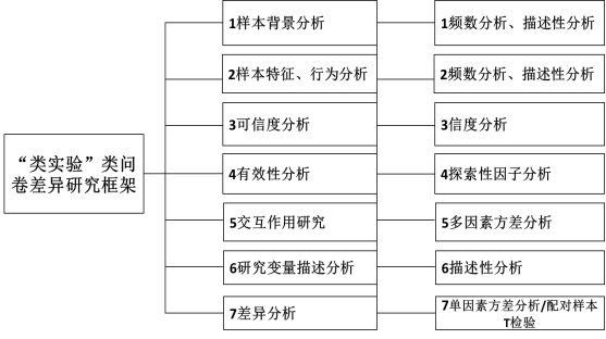 “类实验”类研究,通常也称作“情景”类研究等,在通常情况下,这类问卷研究影响关系并不通过回归分析,而是通过差异研究分析,如果具有差异性其说明变量之间有影响关系,反之则说明没有影响关系。此类框架在市场研究、教育学、心理学中相对较为常见,通常均是使用量表类问卷题。