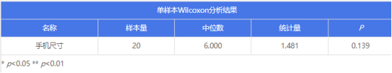 单样本Wilcoxon检验用于检验数据是否与某数字有明显的区别,比如手机尺寸是否明显不等于6英寸。