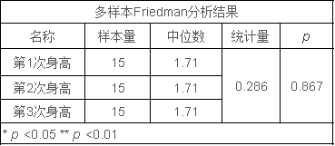 上表格中P值为0.867>0.05,即说明3次测量结果上并不会呈现出显著性差异,而且具体对比中位数可以看出,整体上看第一次测量身高中位数为1.710,第二次也是1.710,第三次还是1.710,因而说明三次测量结果并没有显著性差异。