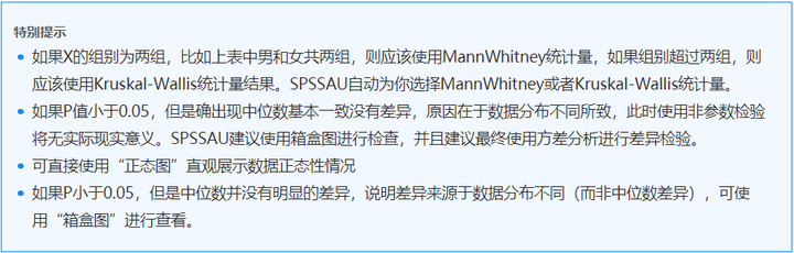 根据X组别的数量不同,需选择的不同的检验方法,如果X为两组,比如性别,则应使用MannWhitney统计量,超过两组,则使用Kruskal-Wallis统计量结果。