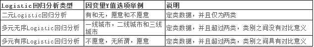 结合Y值的具体情况,Logistic回归分析共分为三种,分别是二元Logistic回归分析,多元无序Logistic回归分析和多元有序Logistic回归分析。分类情况如下表所示。