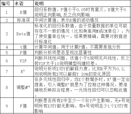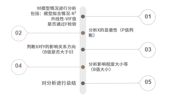 ① 首先分析模型拟合情况,即通过R平方值分析模型拟合情况,以及可对VIF值进行分析,判断模型是否存在共线性问题【共线性问题可使用岭回归或者逐步回归进行解决】;
