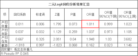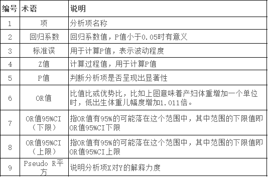 这个表格用于研究X对于Y的影响关系情况,表格中有意义的指标信息包括:P值,回归系数,OR值和R Pseudo R²。其它指标包括标准误,Z值,95%CI值意义相对较小。