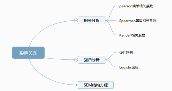 针对变量关系研究方法,包括了相关关系研究以及影响关系研究,大致将常用分析方法归纳为:相关分析,线性回归分析,Logistic回归分析,SEM结构方程