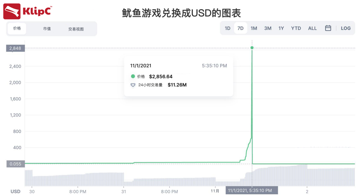 KlipC的Andi Duan表示:“鱿鱼币于10月29日正式发行,起初发行价仅为1美分,24小时内该币发布后就开启暴涨模式,然而11月1日该币由2861美元的峰值跌至0.0007美元,闪崩后仍有4万人持有该币。