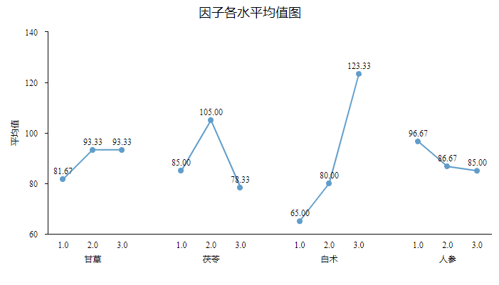 极差分析表格中可知:从4个因素来看,结合R值(因素极差值)的大小对比可知,因子白术是最优因素,其次是因子茯苓,最后是因子甘草和人参。
