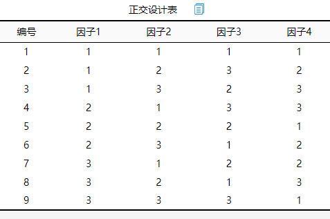 然后点击开始分析,即可得出正交设计表(9次实验,4因素3水平):