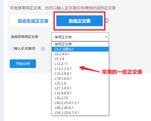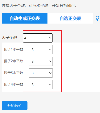 关于正交表的选择,如果不希望SPSSAU自动生成,也可以自己选择,点击【自选正交表】-在【常用正交表】下拉框中选择合适的。