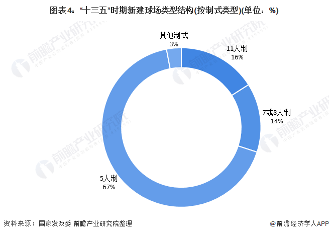 同时从球场类型看,5人制球场是“十三五”时期全国各省市新建球场时首要选择的球场类型,占比超过一半,达到了67%;其次是11人制球场,占比为16%;7人或8人制球场占比为14%;其他制式球场占3%。