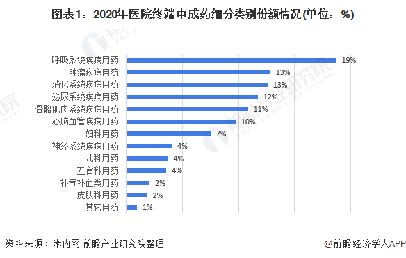 中成药在部分疑难杂症以及慢性病领域具备一定优势,呼吸系统疾病用药、肿瘤疾病用药、消化系统疾病用药、骨骼肌肉系统疾病等是中成药的优势领域,2020年呼吸系统疾病用药位居医院购进金额首位,市场份额始终保持在19%;肿瘤疾病用药一直排在购药金额的第二位,2020年占医院终端药品购进金额的13%;作为排名第三的细分类别,消化系统疾病用药2020年占医院终端药品购进金额的13%;骨骼肌肉系统疾病也是中成药占据优势的治疗领域之一,2020年医院购进金额占比11%。