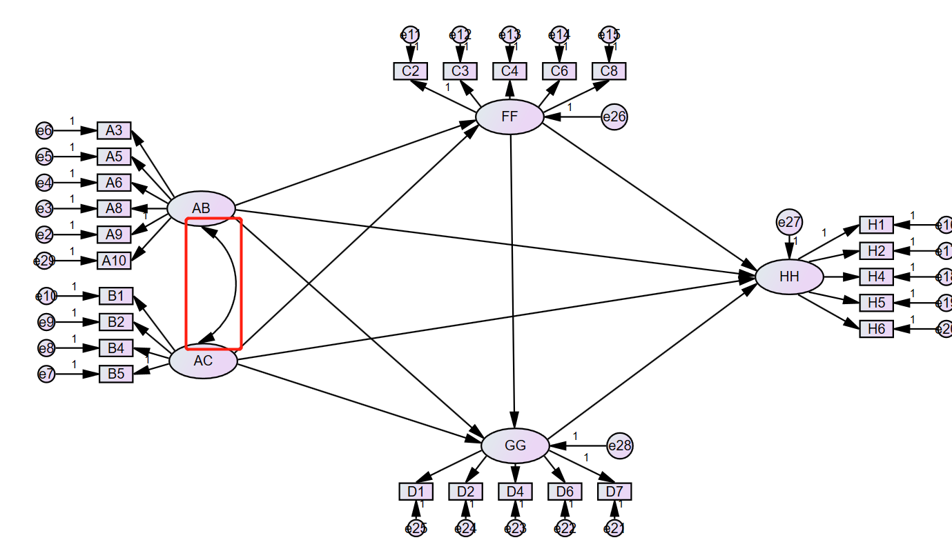 模型如图所示,amos的外生潜变量之间的双箭头加上后,验证结果不理想,但是拟合度高。而外生潜变量之间的双箭头不加上时,验证效果理想,拟合度正常。但是看了AMOS教学视频,和网上搜集信息来看,AMOS的外生潜变量之间必须加上双箭头建立关系,我的两个外生潜变量是一个定义下的两个维度,我根据文献将定义A划分为B与C。求大神指教,要不要加双箭头,如果不加是否可以。