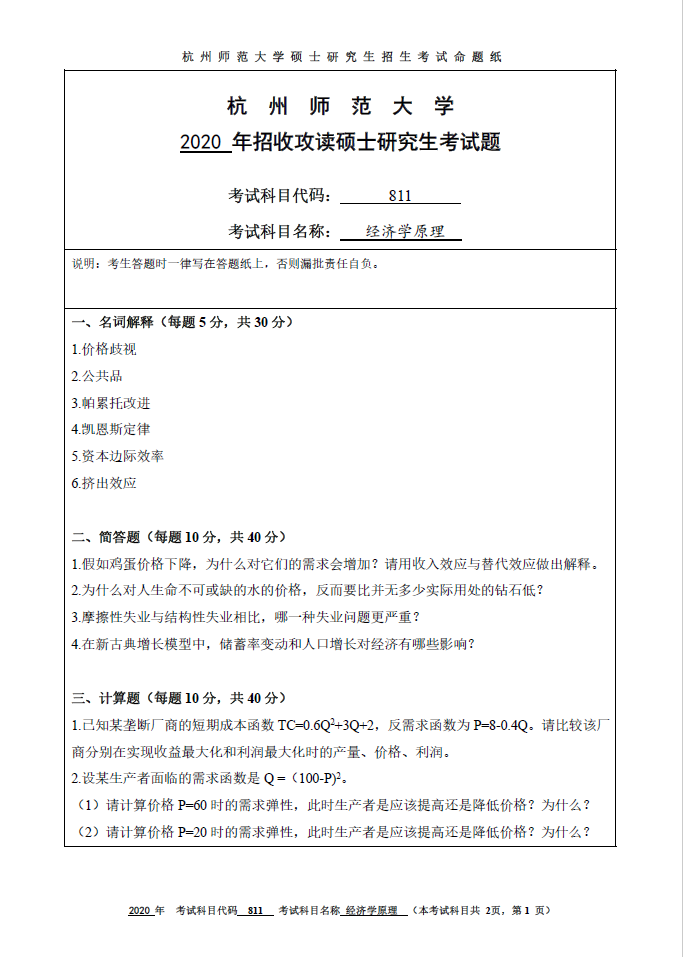811经济学原理(杭州师范大学2020年招收攻读硕士研究生考试题).pdf