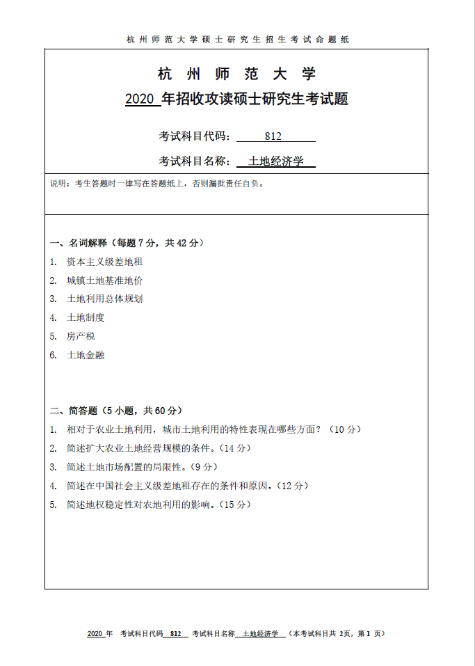 812土地经济学(杭州师范大学2020年招收攻读硕士研究生考试题).pdf