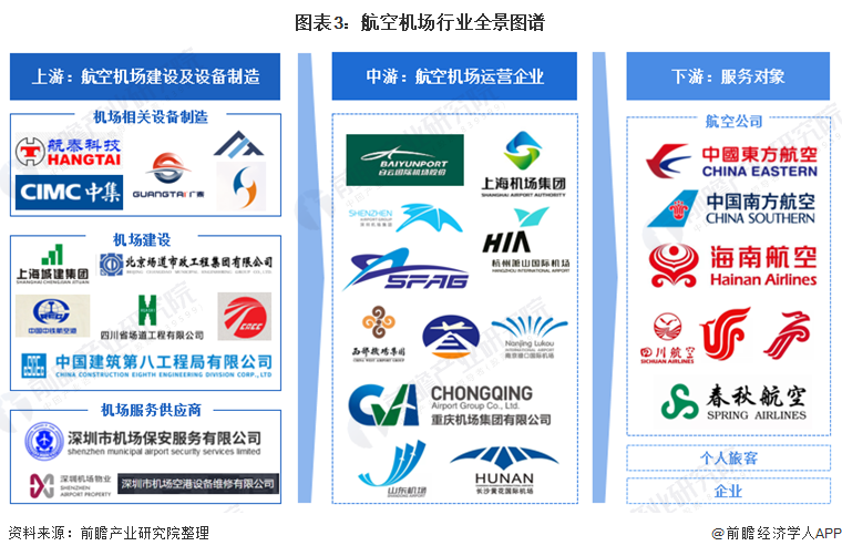 从航空机场行业产业链条的主要参与者来看,航空机场行业上游机场相关设备制造企业主要有航泰科技、威海广泰等,机场建设企业主要有中国民航机场建设集团、上海城建集团等,机场服务供应商主要有深圳市机场保安服务公司、深圳机场物业公司等;航空机场运营企业主要有广州白云国际机场股份有限公司(广州白云国际机场)、深圳市机场股份有限公司(深圳宝安国际机场)、北京首都国际机场股份有限公司(北京首都国际机场)等;航空机场行业下游主要企业有中国国际航空股份有限公司、中国南方航空股份有限公司、中国东方航空股份有限公司等。